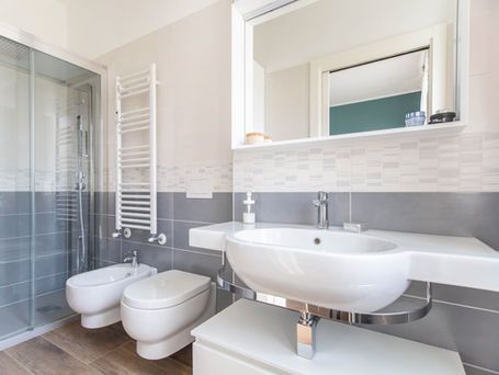 La stessa tinta si ritrova sulla parete dietro il letto nella camera matrimoniale, che si contraddistingue invece per due comodini dal carattere scandinavo differenti tra di loro e una cabina armadio posizionata sulla destra rispetto alla porta d’entrata. La cucina, che richiama sui piani di lavoro l’effetto legno del pavimento, si sviluppa su due pareti frontali e vanta dei comodi fornelli elettrici e un tavolo all’americana. Completano la casa due bagni, di cui uno dai contrasti grigio/bianco capaci di dividere visivamente in due la verticalità della parete, dove sono state posate delle mattonelle in gres porcellanato fino a 200 cm di altezza.