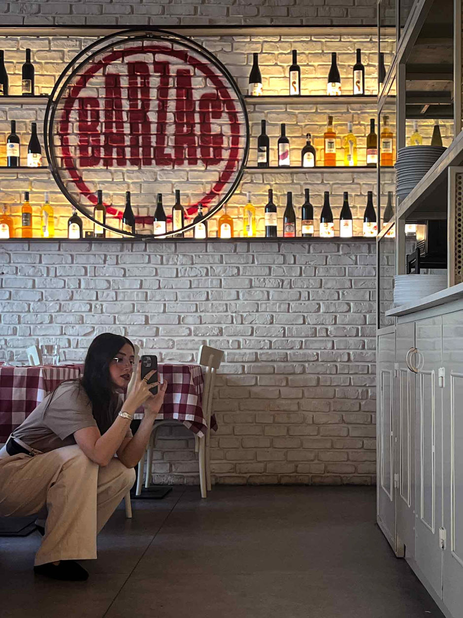 Per il bagno clienti abbiamo scelto di riprendere il colore “Barzac” e i materiali già utilizzati nel progetto, reinterpretandoli in una chiave più audace. Abbiamo quindi creato una “scatola rossa”, arricchita da un’illuminazione suggestiva ottenuta grazie a una griglia sospesa in lamiera forata. La lamiera forata che è stata utilizzata anche nella sala, ha permesso in questa sua declinazione di creare un interessante gioco di luci e trasparenze.
