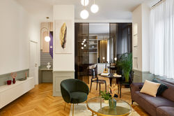 All’idea generale del progetto conseguono poi i materiali impiegati: dal rovere naturale a spina italiana dei grandi maestri bergamaschi Parquet Clio Project, legno fortemente utilizzato nella liberty milanese, agli arredi mobili vintage in midollino e vetro specchiato bronzato, fino agli elementi più decorativi come le tappezzerie con i decori astratti geometrici del Designer Gian Battista Andrea Marongiu che ha reinterpretato alcune sue già note carte per noi.