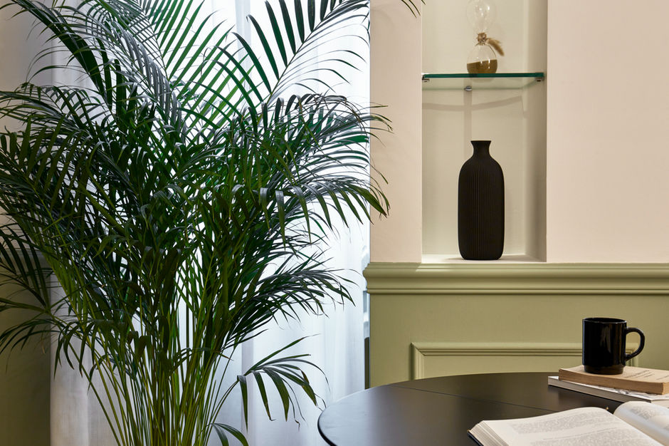 Per tutta la zona giorno corre una boiserie in gesso, composta da specchiature geometriche, modanature e una cornice ad un’altezza di novanta centimetri. Il verde pastello, presente una volta sulla boiserie, un'altra sulla carta da parati, un'altra ancora sugli arredi e sulle opere d'arte, lega ogni ambiente della casa.