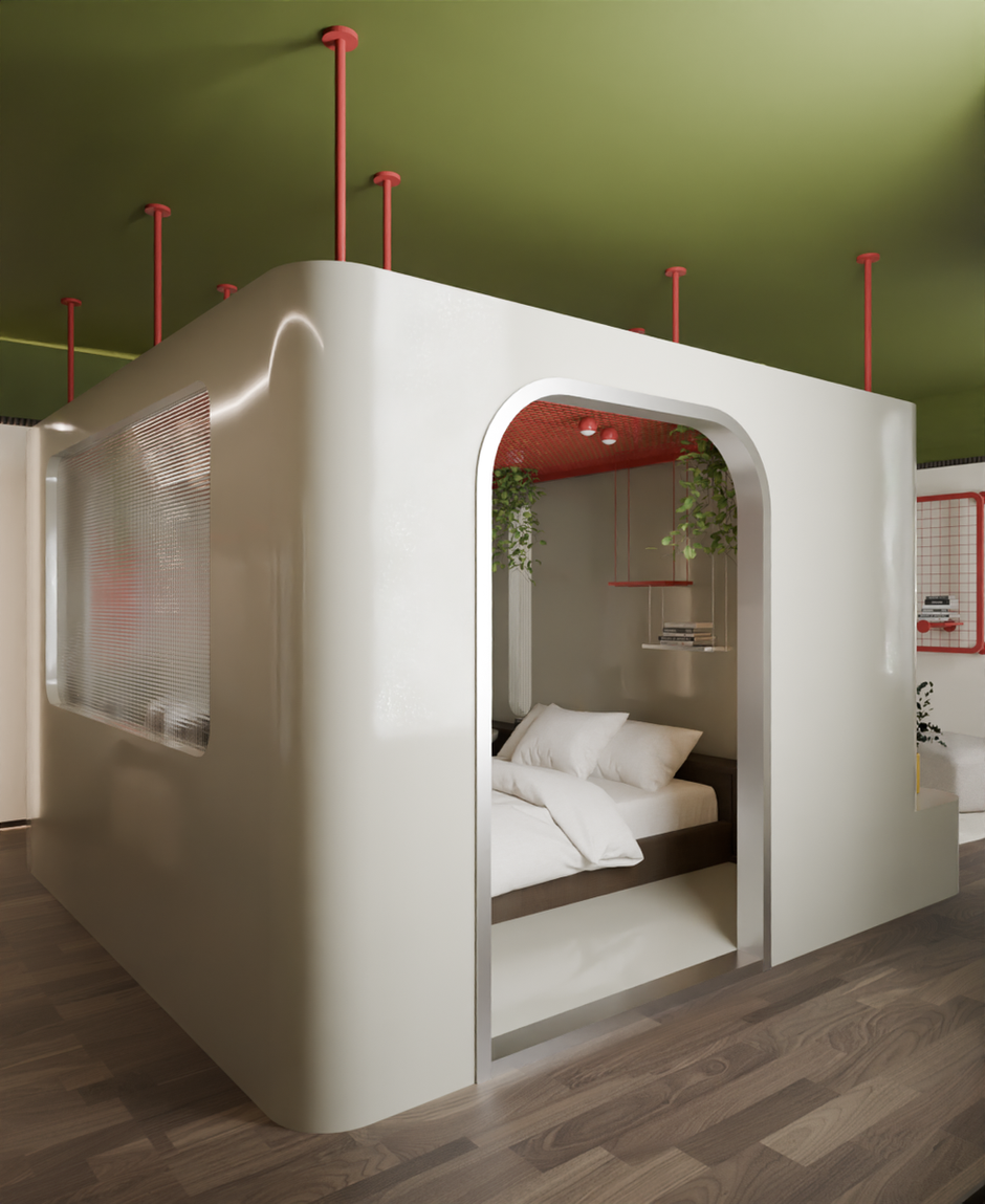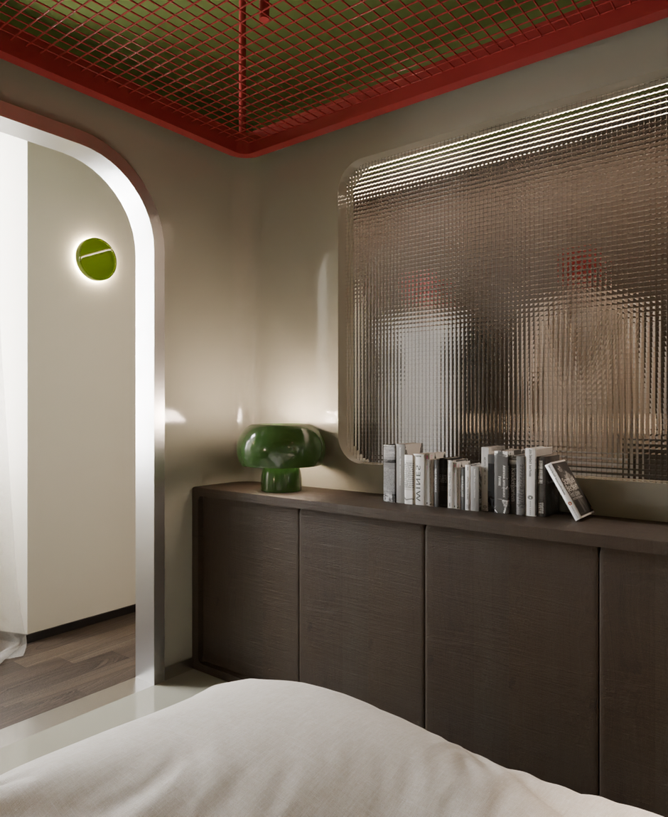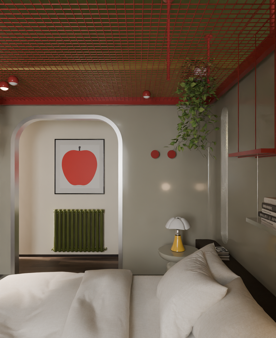 Two design rules connect all environments. Rounded-corner volumes protrude from ceilings, floors, or walls, defining thresholds and transitions. A striking red grid system, anchored via terminal connections marked by circles, establishes a strong visual identity. These grids serve multiple functions: sometimes as joints between structure and masonry, other times as lighting elements, hooks, or supports.