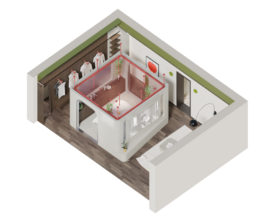 The volumes create a box within a box, a nest within the nest, maximizing protection. They interrupt flows and force a pause, a shelter. Everything else—the red grids and optical cones—projects toward the city, evocatively through vibrant colors and the definition of visual axes.